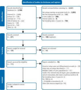 Materials and methods PubMed, Embase, The Cochrane Library, Web of Science and Scopus were searched systematically up to 16 October 2020. In total, 3,768 studies were screened, with their results for survival, failure mode, deterioration and variables affecting survival.
