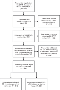 We selected patients diagnosed between 2014 and 2017 with advanced melanoma and a known BRAFV600-mutation treated with first-line BRAF/MEK inhibitors or anti-PD-1 antibodies, registered in the Dutch Melanoma Treatment Registry. Patients were matched based on their propensity scores using the nearest neighbour and the optimal matching method.