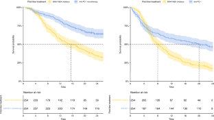 Between 2014 and 2017, a total of 330 and 254 advanced melanoma patients received BRAF/MEK inhibitors and anti-PD-1 monotherapy as first-line systemic therapy. In the matched cohort, patients receiving anti-PD-1 antibodies as a first-line treatment had a higher median and 2-year overall survival compared to patients treated with first-line BRAF/MEK inhibitors, 42.3 months (95% CI: 37.3-NE) vs. 19.8 months (95% CI: 16.7–24.3) and 65.4% (95% CI: 58.1–73.6) vs. 41.7% (95% CI: 34.2–51.0).