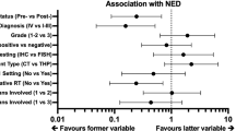 Survival endpoints were analysed using the Kaplan–Meier (K–M) method. The median survival rates were reported with their 95% CI. Median follow-up was calculated using the reverse K–M method. Multivariate analyses were conducted based on Cox’s proportional risk method, and after checking the risk proportionality hypothesis. Univariate Cox regression analysis was performed first to assess the association between each variable and RFS, followed by multivariate Cox regression analysis after selecting factors from univariate regressions that showed statistically significant association with survival with p < 0.15. For the final multivariate model, only factors statistically significant at p < 0.05, based on the Wald or likelihood ratio test if appropriate, after adjustment for the other factors, will then be introduced in the final model. Stepwise multivariable regression analysis with backward selection was also performed.