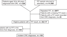 Continuous variables were described with medians (interquartile ranges) and categorical variables were described with numbers (percentages). Logistic regression was used to assess the associations between individuals’ and tumours’ characteristics and the risk of having a FIT-IC versus a screen-detected CRC. Crude and adjusted odds ratios (for age and gender) with 95% confidence intervals were reported. In this study, stage I was used as the reference to enable the comparison with other studies where only stages I–IV were included [8, 10,11,12, 31]. FIT-IC proportions for different profiles combining individuals’ and tumours’ characteristics were presented. FIT-IC proportion was calculated as the number of FIT-ICs divided by the total number of FIT-ICs and screen-detected CRCs and presented as percentage to enhance comprehension [11, 12, 16]. We also examined the distributions of FIT results among FIT-ICs in the first/second year of the screening interval and by patients’ and tumours’ characteristics to explore the impact of shortening FIT screening interval or lowering FIT cut-off on reducing FIT-ICs. There is discrepancy among guidelines regarding whether to include in situ cancers in the definition of colorectal carcinoma (TNM and Japanese classification systems) or not (European and US classification systems) [3, 30, 33]. To facilitate the comparison of our findings with those of other studies, we present, where it is possible, the results for in situ cancers as a separate group from invasive cancers.