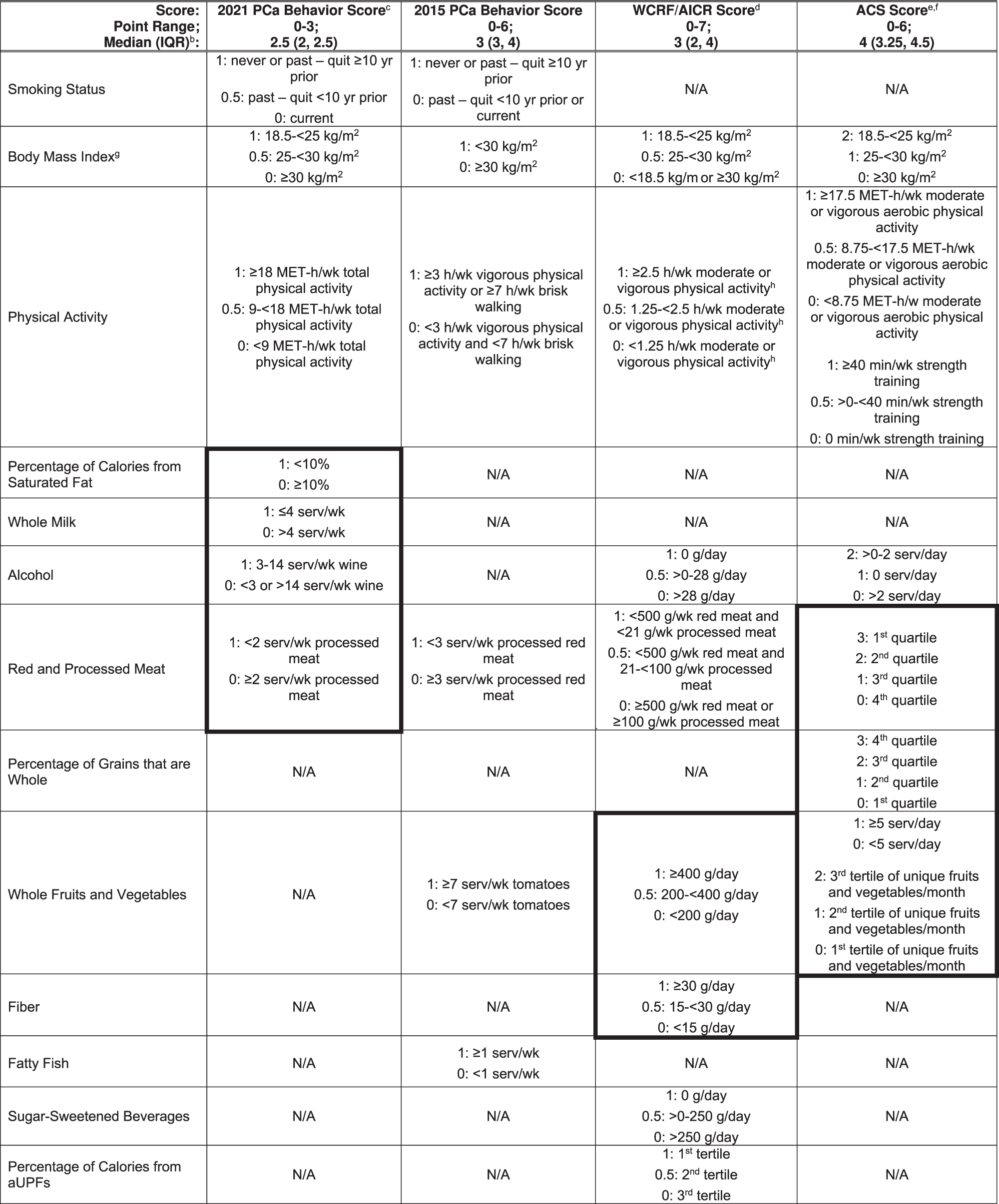 Table 1 Components and point assignment of the 2021 PCa Behaviour Score, 2015 PCa Behaviour Score, WCRF/AICR Score, and ACS Scorea.