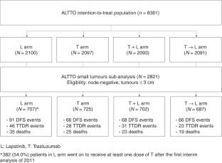 The ALTTO trial randomised 8381 patients with early HER2-positive BC treated with adjuvant chemotherapy (anthracycline/taxane- or taxane/carboplatin-based), to trastuzumab (T), lapatinib (L), their sequence (T → L) or their combination (L + T). Patients with tumours ≤3 cm and node-negative were included in this sub-analysis.