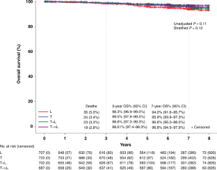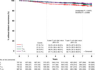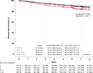 A total of 2821 patients were analysed (median follow-up of 7 years). The median age was 52 years, and most patients had tumours ≤2 cm (64.3%). The 7-year disease-free survival (DFS) was 88.1% (95% CI: 86.7–89.3%). DFS was similar for arms T, T + L and T⟶L and significantly lower for arm L (stratified log-rank P = 0.031). The 7-year overall survival rate was 95.9% (95% CI: [95.0–96.6%) and the 7-year time-to-distant recurrence was 93.4% (95% CI: 92.3–94.4%).