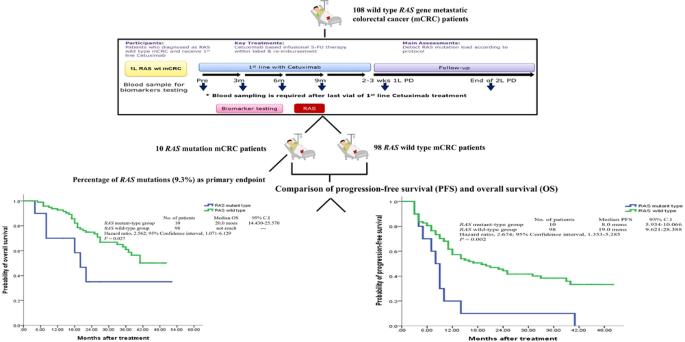 This investigator-initiated trial (IIT) was a single-arm, noninterventional, uncontrolled multicenter study performed in four member hospitals of the Colorectal Cancer Consortium in Taiwan. The definition of mCRC was metachronous or synchronous adenocarcinoma with distant metastasis. Patients with RAS wild-type mCRC diagnoses after formalin-fixed, paraffin-embedded (FFPE) tumour tissue and ctDNA examination were recruited, and the emergence of RAS mutations in patients with mCRC receiving a cetuximab-based regimen as first-line treatment was evaluated. In addition to cetuximab, infusional 5-fluorouracil (5-FU) in combination with oxaliplatin or irinotecan as first-line treatment was required for inclusion. Treatment was continued until disease progression, the occurrence of intolerable toxic effects, or withdrawal of consent. Blood samples were collected before the start of treatment and every 3 months during first-line treatment. When disease progression occurred, blood sampling was also required within 3 weeks following cetuximab and second-line treatments. The blood samples were sent to the central laboratory at Taipei Institute of Pathology and tested for the RAS genotype using the MassARRAY platform combined with the single allele base extension reaction (SABER) technique (Agena, San Diego, California, USA). Pretreatment tissue sections were re-evaluated for the RAS genotype using this technique if inconsistency regarding RAS was detected between the tissue and blood samples of the same patient. The study design, patient characteristics, inclusion and exclusion criteria, and detailed treatment regimens, including patient withdrawal data, were described in our study protocol [32]. This protocol is briefly outlined in Supplementary Fig.Ā 1.