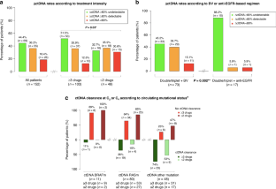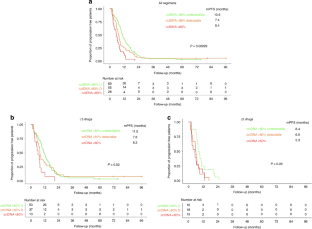 Pretreatment ctDNA was detected in 129/152 (84.9%) of patients. A ∆ctDNA ≥ 80%_undetectable was more frequent in Group ≥ 3 than ≤ 2 drugs (respectively 51.5% vs. 32.7%, p = 0.015). Patients with ∆ctDNA ≥ 80%_undetectable had longer survival than other ∆ctDNA subgroups, in Group ≥ 3 drugs (mPFS 11.5 vs 7.8 vs 6.3 months, p = 0.02: mOS 30.2 vs 18.1 vs 16.4 month, p = 0.04) and in Group ≤ 2 drugs (mPFS 8.4 vs 6.0 vs 5.3 months, p = 0.05; mOS 29.6 vs 14.6 vs 14.6 months, p = 0.007).