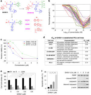 GH501 demonstrates nanomolar potency in the NCI-60 human cancer cell panel and multiple mCRPC cell lines with diverse genetic backgrounds, including those resistant to androgen deprivation therapy drugs. Mechanistically, GH501 may bind Skp1 and disrupt the physical interaction between Skp1 and S-phase kinase-associated protein 2 (Skp2) within the Skp1-Cullin1-F-box protein ubiquitin ligase complexes (SCF), thereby affecting multiple oncogenic signals implicated in mCRPC progression, including p21, p27, β-catenin, cyclin D1, enhancer of zeste homolog 2 (EZH2), c-Myc, and survivin. GH501 exhibits excellent in vitro and in vivo safety pharmacology, and GH501 monotherapy effectively inhibits the in vivo growth of cell- and patient-derived xenografts in intraosseous and subcutaneous models. Skp1 expression is significantly increased in human prostate cancer specimens.