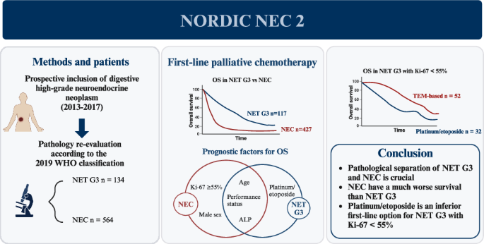 Due to few clinical studies on digestive NEC, treatment has been extrapolated from small-cell lung cancer with cisplatin or carboplatin with etoposide as the established first-line palliative chemotherapy [2, 7]. However, the benefit is limited as up to 30% of patients experience immediate disease progression and median overall survival (OS) is only 11-12 months (m) [2, 5, 8,9,10,11,12]. The retrospective NORDIC NEC study showed that cases with a Ki-67 < 55% had a lower response rate (RR) to platinum/etoposide but a longer survival, however this study did not separate between NEC and NET G3 [8]. The optimal treatment for patients with NEC with Ki-67 < 55% remains uncertain. Limited data exist on predictive factors for response to platinum/etoposide treatment in NEC, although some prognostic factors have been identified in retrospective studies [2, 13].