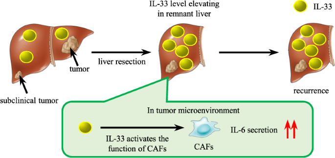 This study indicated that IL-33 facilitates iCCA growth through fibroblast activation and is associated with intrahepatic recurrence.