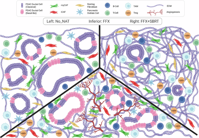 Pancreatic ductal adenocarcinoma (PDAC) remains one the deadliest tumours, with a 5-year survival rate under 12% [1]. Despite the introduction of more active multi-agent chemotherapy like FOLFIRINOX [FFX], therapeutic progress has been limited [2,3,4]. Immune checkpoint inhibitors (ICIs), cancer vaccines and targeted therapy have shown little to no positive clinical impact, largely due to the PDAC’s complex and resistant tumour microenvironment (TME) [5, 6]. Therefore, understanding how current therapies used in daily-practice modulate the PDAC’s TME is essential.
