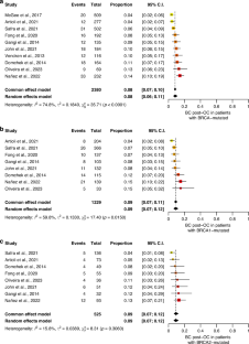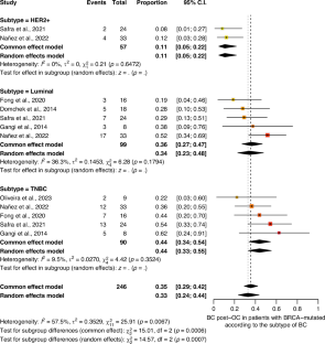 A total of 2380 patients from 10 retrospective cohort studies were included. Among them, 181 (8%; 95% CI: 6%–11%) developed BC post-OC, with similar rates observed for BRCA1 and BRCA2-mutated (9%; 95% CI: 7%–12%). In overall survival analysis, BRCA-mutated patients who developed BC after OC had significantly improved outcomes compared to those with OC only (HR = 0.4657; P < 0.001).