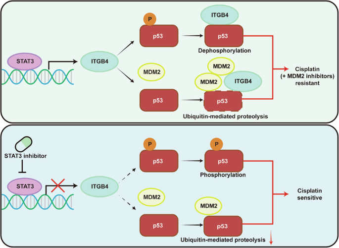 In this study, we demonstrated that ITGB4 plays a key role in regulating the sensitivity of p53 wild-type (WT) BC to cisplatin therapy. Our findings revealed that ITGB4 inhibits the activation of p53 by suppressing the phosphorylation at the p53-S15 site and promotes the degradation of p53 by facilitating the binding of MDM2 to p53, thereby reducing the sensitivity of BC to cisplatin.Additionally, we showed that ITGB4 influences the antitumor effects of MDM2 inhibitors when they are combined with cisplatin therapy. Furthermore, we found that the elevated expression of ITGB4 in cisplatin-resistant BC cells were mediated by STAT3 activation. The combination of STAT3 inhibitors can enhance the antitumor effect of cisplatin in BC.