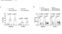 Western blotting was performed according to routine protocols. The proteins were extracted from 293T cells, HeLa cells or tumours. The whole extracts were analysed using SDS-PAGE and transferred to a 0.45 µm PVDF membrane (Cat# NK0414, Roche Diagnostics, Indianapolis, IN, USA). The membranes were blocked with 5% non-fat dried milk in TBST (20 mM Tris-HCl, pH 7.5, 150 mM NaCl, 0.1% Tween-20) and incubated with the antibodies overnight at 4 °C, followed by the horseradish peroxidase-conjugated secondary antibody. The protein bands were visualised by incubating membranes with the ECL Plus detecting reagents (Millipore, Billerica, MA, USA). Band intensity values were obtained using ImageJ (version J2, NIH, Maryland, US). Data were prepared as excel files and analysed by microsoft excel software.