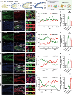 During dentate gyrus development in neonatal mice, the active transcription mark H3K4me3 and the repressive mark H3K27me3 are co-localized at the promoter regions of essential neurodevelopmental genes, and thus forming bivalent chromatin domains in neural stem cells. These domains serve as a “molecular switch” that regulates the dynamic processes of cell proliferation and differentiation. The enhanced ratio of H3K4me3 to H3K27me3 markedly upregulates the expression related genes, thereby promoting cell proliferation and neuronal differentiation, ultimately leading to improved spatial learning and memory. Conversely, decreasing this ratio has the opposite effect.