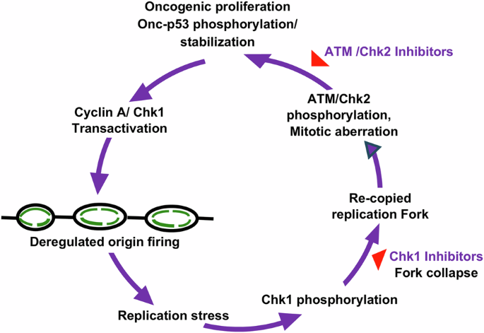 Onc-p53 induces Chk1 expression that prevent collapse of unscheduled replication forks it generates [14], thus causing replication stress and induction of ATM signaling (Figs. 1–4). Since inhibition of Chk1 activity induces replication fork collapse [14, 54], Chk1 and ATM kinase inhibitors were used as tools to investigate dependency of lung cancer cells with Onc p53 on replication stress and induction of ATM signaling.