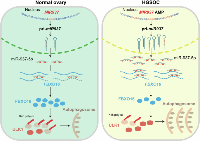 The data presented here demonstrate that MIR937 copy number changes functioned through miR-937-5p to dictated autophagy and cell proliferation of HGSOC cells. MIR937 deficiency abolished miR-937-5p inhibitory effect on FBXO16, resulted in accumulation of ULK1 protein, and enhanced autophagy, thereby facilitating OV cell proliferation and accelerating tumor progression. Mechanistically, MIR937 copy number amplification upregulated miR-937-5p, which strengthened its binding with 3′ UTR of FBXO16, and attenuating FBXO16 mediated ULK1 degradation via SCFFBXO16 complex. Importantly, FBXO16 is downregulated and ULK1 is upregulated in MIR937 amplified HGSOC samples, and FBXO16highULK1low favors survival for HGSOC patients. Collectively, these results unveiled a regulatory axis for promoting OV carcinogenesis elicited by MIR937 amplification.