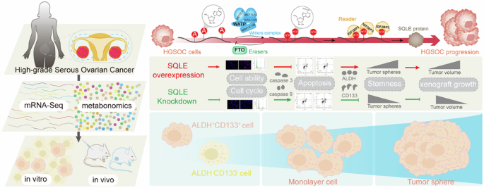 In this study, we found the abnormal expression of SQLE was regulated by the methyltransferase Wilms tumor 1-associated protein (WTAP), demethylases fat mass and obesity-associated (FTO), and the insulin-like growth factor 2 mRNA binding protein 3 (IGF2BP3). Here, SQLE is required for maintaining HGSOC stemness and plays a positive role in promoting both tumorigenesis and cholesterol synthesis in HGSOC. It implies that SQLE may serve as a novel therapeutic target in HGSOC.