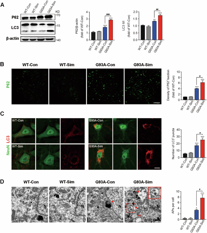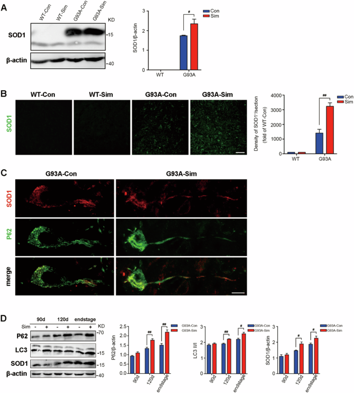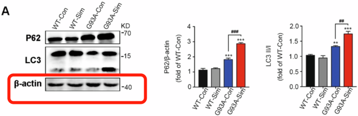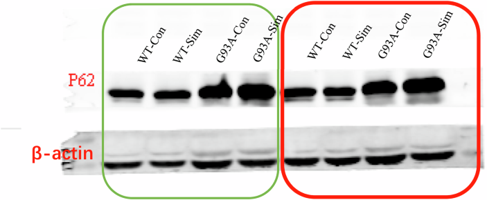 Eight bands represent two independent experiments (marked with red and green boxes respectively) The order of the samples is WT-Con, WT-Sim, G93A-Con, G93A-Sim. The red box represents the β-actin image that correctly corresponds to the P62 image shown in Fig. 1A.