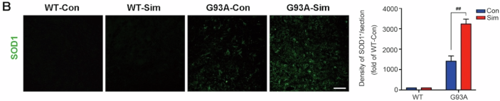 In WT group (WT-Con and WT-Sim), there was no accumulation of SOD1 by fluorescent staining, and the image showed mainly background.