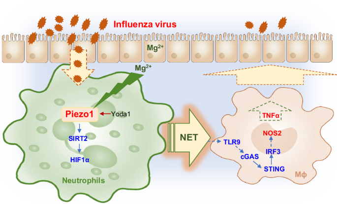 Recent studies have reported that Piezo1 is involved in regulating the functions of various immune cells, including macrophages, DCs and T cells, in infectious inflammation and cancer. Piezo1 regulates macrophage polarization and stiffness sensing for macrophage activation [45]. The Piezo1-mediated macrophage inflammatory response to LPS occurs through the TLR4 pathway [36]. DC Piezo1 directs reciprocal differentiation between TH1 and regulatory T cells [21]. However, the regulatory role of Piezo1 in neutrophils has not been reported. Our data showed that influenza virus infection initiated Piezo1 activity and directed neutrophil NET formation. The ion channel Piezo1, as a signal node, senses the magnesium concentration and integrates the downstream SIRT2–HIF1α signalling pathway to direct NET formation during the response to viral infection.