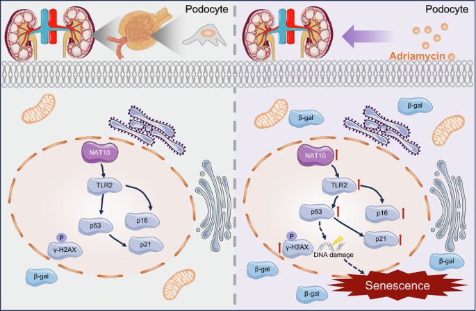 In summary, this study revealed the crucial role of NAT10 in regulating DNA damage and senescence-related genes in the ADR-induced nephropathy model. Mechanistic studies showed that NAT10 exerts antisenescence and protective effects by downregulating TLR2 expression. Together, these findings suggest that NAT10 could be a promising therapeutic target for ADR-induced podocyte injury and senescence.