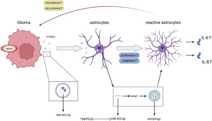In this study, whether GDEs contribute to the activation of normal astrocytes in the TME was investigated and the underlying mechanisms were explored. GDEs induce autophagy and activate normal human astrocytes (NHAs). Compared with GDEs under normal conditions (N-GDEs), hypoxic GDEs (H-GDEs) induce stronger activation of NHAs. Next, upregulated miRNAs in H-GDEs were compared to N-GDEs and found that only miR-423-3p in H-GDEs markedly induced autophagy in NHAs and subsequently promoted their activation. Moreover, the downstream cellular mechanisms were explored and LAMP3 was identified as an important molecule that mediates miR-423-3p-induced autophagy in NHAs. Using the Connectivity Map (CMap) database, 15-deoxy-Δ12,14-prostaglandin J2, a selective and covalent PPARδ agonist, was identified as a potent inhibitor capable of suppressing the activation of NHAs.