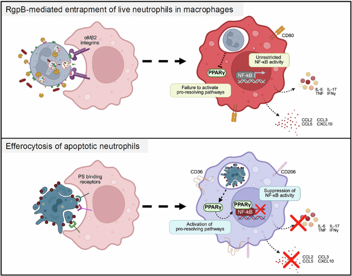 Efferocytosis, or the uptake of dead cells, is critical in preventing an excessive immune response to infection [58]. Our in vivo data showed that the entrapment of live neutrophils led to significant inflammatory responses that also impacted the bystander macrophages within the tissue milieu, possibly contributing to the perpetuation of dysregulated inflammatory responses. Interestingly, unresolving low-grade inflammation is a hallmark of periodontitis and Pg pathogenesis and has been mechanistically linked with enhanced susceptibility to several systemic chronic inflammatory or autoimmune diseases in humans [59]. Using RNA-seq, we were able to show that macrophages with entrapped live neutrophils showed a profound failure in the activation of PPAR-γ regulated pro-resolution pathways. However, the alternate utilization of αMβ2 integrin for entrapment of live neutrophils might further contribute to sustaining inflammation. Aside from being an important phagocytic/efferocytic receptor, αMβ2 integrin signaling can also positively modulate TLR signaling. αMβ2 integrin activation (outside-in signaling) induces phosphatidylinositol-bisphosphate (PIP2) production by phosphatidylinositol 5-kinase (PI5K), allowing for the docking of Mal adapter proteins and downstream recruitment of MyD88 for the initiation of TLR2/4 signaling and inflammatory cytokine production [60]. In the absence of PS receptor engagement, it is possible that αMβ2 integrin activation might augment inflammatory outcomes during live cell efferocytosis as observed in vitro and in vivo (Figs. 3, 4). Another contributing factor could be a delay in the downstream maturation of live neutrophil containing phagosomes, resulting in delayed degradative clearance of ingested cargo. In concordance with this hypothesis, we saw significant delays in several catabolic and degradative pathway genes in macrophages with entrapped live neutrophils (Fig. 4). Incomplete degradative clearance of efferocytosed apoptotic cells has been mechanistically linked with several chronic inflammatory and autoimmune consequences, often due to the generation of self-reactive T cell clones and auto-antibody-mediated tissue destruction [42, 58]. In MCs, entrapped activated neutrophils eventually undergo apoptosis, and recycling their antimicrobial proteins increases mast cell ‘fitness’ in a model of allergic inflammation [8]. While our unpublished observations point to a slower death of entrapped neutrophils in the context of Pg infection, the molecular mechanisms of their clearance, metabolic and transcriptional responses, and immune consequences are beyond the scope of the current manuscript.