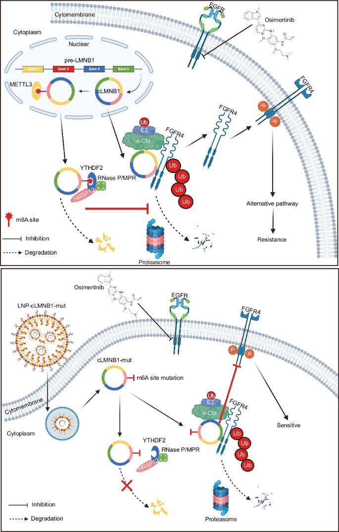 This study found that the circRNA LMNB1 (cLMNB1) enhanced the interaction between FGFR4 and the E3 ubiquitin-protein ligase CBL (c-Cbl), overcoming osimertinib resistance in LUAD. In addition, we found that cLMNB1 is degraded by the reader protein YTHDF2 after undergoing METTL3-mediated m6A modification. Furthermore, LNP-encapsulated cLMNB1 with an m6A modification site mutation (cLMNB1-mut) exhibited superior efficacy in osimertinib-resistant LUAD.