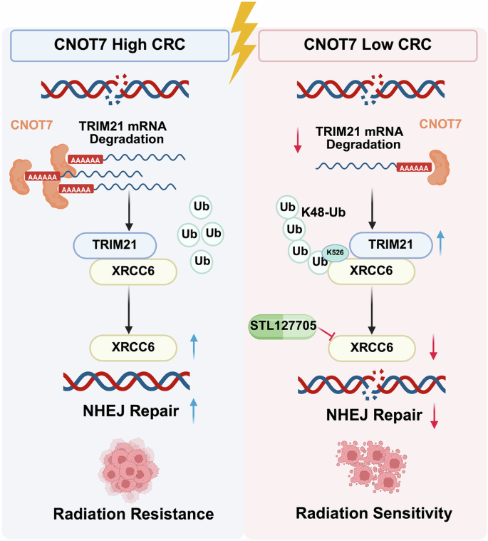 In conclusion, our study shows that elevated CNOT7 expression is strongly linked to radiotherapy resistance and poor prognosis in CRC. Mechanistically, CNOT7 regulates ubiquitination of XRCC6 K48 chain and Lys526 site through TRIM21, thereby stabilizing XRCC6 protein. XRCC6 promote DNA damage repair via the NHEJ pathway, imparting radiotherapy resistance to CRC cells. Our study indicates that CNOT7 could serve a potential therapeutic target to overcome radiotherapy resistance in CRC.