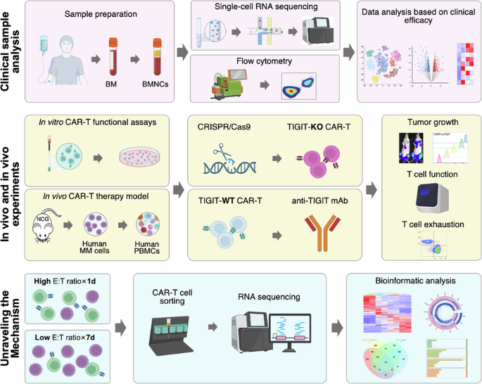 In summary, while BCMA-CAR-T therapy represents a major advance in RRMM treatment, its durability remains limited, highlighting the urgent need for strategies that enhance efficacy. Through single-cell RNA sequencing and flow cytometry, we identified TIGIT overexpression as a key factor associated with relapse following BCMA-CAR-T therapy. Functional studies demonstrated that TIGIT blockade alleviates T cell exhaustion and enhances CAR-T antitumor activity, with anti-TIGIT mAb showing superior effects compared to TIGIT knockout. Mechanistically, RNA sequencing and preliminary functional experiments suggested that upregulation of BATF3 may be a key mechanism through which TIGIT regulates CAR-T cell function. These findings provide experimental evidence supporting TIGIT as a critical resistance mechanism in BCMA-CAR-T therapy and establish it as a promising therapeutic target in MM. Given the ongoing clinical development and anticipated availability of anti-TIGIT antibodies, combining BCMA-CAR-T therapy with TIGIT blockade may represent a promising strategy to improve clinical outcomes for MM patients.