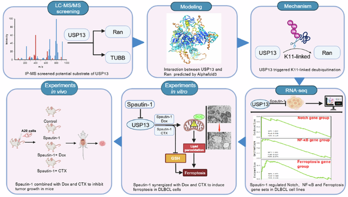 In this study, employing LC-MS/MS, we identified Ran GTPase (hereafter refer to as Ran) as the potential substrate of USP13 in DLBCL via affinity purification and proteome-wide study. Bioinformatic analysis showed overexpression and correlation of USP13 and Ran as well as their role in DLBCL progression. Further Alphafold3 prediction and wet-bench experiments confirmed Ran as a bona-fide substrate of USP13 and delineated how USP13-Ran cascade modulated DLBCL pathogenesis. The USP13 inhibitor Spautin-1 induced ferroptosis in DLBCL through the regulation of NF-κB and Notch signaling and well synergized with conventional DLBCL chemo-agents, validated by both in-vivo and in-vitro experiments.