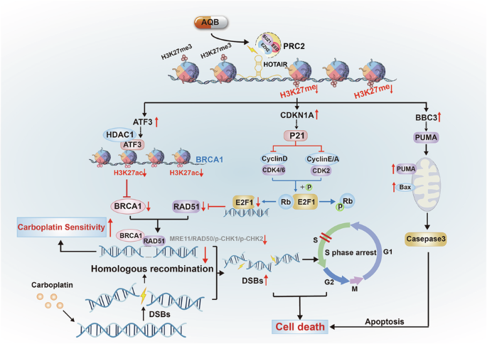 To further investigate the role of AQB in regulating the HRR pathway, this study provides an in-depth analysis of its impact on key HRR-related molecules, particularly the regulation of RAD51 and BRCA1.RAD51 is a core protein of the HRR pathway, essential for the effective repair of double-strand breaks (DSBs). It primarily functions by promoting precise pairing and exchange between the damaged DNA strand and the intact homologous strand, enabling accurate DNA repair [50]. E2F1 has been demonstrated to facilitate DNA repair by promoting the recruitment of repair-related proteins to sites of DNA damage [51, 52]. Our results demonstrate that AQB upregulates CDKN1A (p21), downregulates E2F1, and suppresses RAD51, consistent with previous studies showing that E2F1 coordinates HR gene programs and directly transactivates RAD51 in response to DNA damage [53, 54]. Loss of E2F1 impairs RAD51-mediated HRR, highlighting its critical role in maintaining genomic stability [27]. Consistently, we found that AQB interferes with HOTAIR–EZH2 binding, thereby blocking CBPt-induced RAD51 upregulation and ultimately leading to HRR inhibition.BRCA1, another essential mediator of the HRR pathway, is responsible for DSB recognition, RAD51 loading, and ensuring repair accuracy [55]. Mutations or loss of BRCA1 can render tumor cells more sensitive to platinum-based chemotherapy, making it a key therapeutic target. ATF3 is a critical regulator of DNA damage response (DDR), stress-induced cellular processes, apoptotic pathways, and immune activity [56]. As a transcriptional repressor, ATF3 competes with other transcription factors for genomic binding or interacts with HDACs and co-repressors to inhibit transcription initiation, leading to target gene downregulation [30]. Our findings reveal that AQB upregulates ATF3 expression by disrupting the binding between HOTAIR and EZH2. Notably, ATF3 binds to the BRCA1 promoter and recruits HDAC1, resulting in the epigenetic repression of BRCA1. These findings highlight novel mechanisms by which AQB regulates key components of the HRR pathway in EC. By modulating RAD51 and BRCA1 activity, AQB disrupts this critical repair pathway, thereby enhancing their sensitivity to chemotherapy. Additionally, we identify a previously unreported role for ATF3 in the epigenetic regulation of BRCA1, providing new insights into modulating HRR and increasing chemotherapy sensitivity in EC.