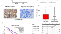 To further determine the expression of KIAA1429 in colorectal cancer, we performed immunohistochemistry analysis of KIAA1429 in colorectal cancer tissues and paired non-tumor tissues. The positive expression of KIAA1429 is more frequent, and the representative images are shown in Fig. 2A. In addition, our western blotting experiment also indicated that the protein level of KIAA1429 in tumor tissue was higher than that in adjacent normal tissues (Fig. 2B). Furthermore, we compared the mRNA and protein expression of KIAA1429 in normal human colon mucosal epithelial cell line (NCM460) and colorectal cancer cell lines (SW480, SW620, HT29, HCT8, HCT116, and LoVo). The results indicated that KIAA1429 was highly expressed in colorectal cancer cells compared with normal colon mucosal epithelial cells (Fig. 2C, D). All these data suggested that KIAA1429 was highly expressed in colorectal cancer cell.