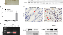 Transwell migration assay were performed in 24-well plates, using a 6.5-mm diameter Transwell chamber with 8-μm pore polycarbonate membrane insert (Corning, MA, USA). After 48 h of transfection, GC cells (3 × 104) were plated on the upper chambers in serum-free medium. RPMI 1640 containing 10% FBS was added to the lower chambers as a chemoattractant. After incubation for 24 h at 37 °C, cells were fixed with methanol, stained with crystal violet solution, and counted using an inverted microscope. The numbers of cells counted in five random fields were averaged.