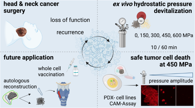 High hydrostatic pressure (HHP) enables complete devitalization of complex tissues of any origin without major changes in structure and biomechanics [1,2,3,4,5,6,7,8,9]. On the one hand, HHP triggers specific cell death by altering the plasma membrane and the tertiary/quaternary protein structure [1, 2]. In contrast, HHP preserves the biomechanics of the extracellular matrix and tumor neoantigens [2,3,4,5,6,7,8,9]. In addition, HHP treatment is cost-effective and avoids toxic substances [4]. Another advantage is the high standardization according to Pascal’s law: pressure acts isostatically and immediately at any cell within complex tissues [10]. Therefore, dose gradients and build-up effects were not observed in this study [4]. At the same time, HHP acts rapidly and can be applied to tissues ex situ during surgery.