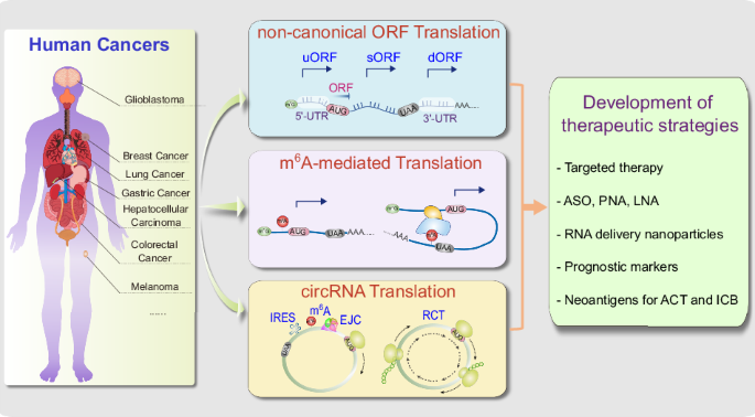 In this section, we will delve into the molecular mechanisms, key recent discoveries, and therapeutic implications of circRNA-driven translation in cancer progression. The biogenesis, detection, biomarkers, and other regulatory functions of circRNAs, including their role as microRNA sponges in cancer, are covered in other reviews [119, 121].