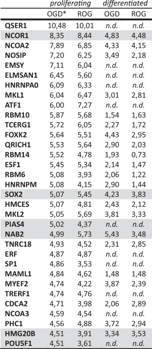 2. aLog2 FC values for top-ranking proteins sumoylated under OGD (OGD vs control), and desumoylated after ROG (OGD vs ROG), in proliferating cells. Values for differentiated cells are also included. Validated proteins are shaded in gray. POU5F1, OCT4.