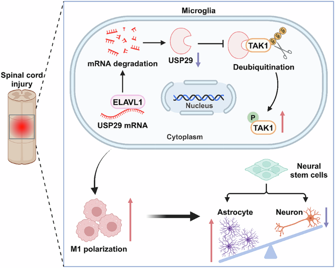 In conclusion, this study reveals that ELAVL1 promotes USP29 mRNA degradation by binding to it, thereby increasing the ubiquitination and activation of TAK1. This drives microglial polarization towards the M1 phenotype, which not only supports NSC differentiation into astrocytes but also hinders their differentiation into neurons, ultimately exacerbating SCI pathology. Conversely, silencing ELAVL1 to regulate USP29 and inhibit TAK1 activation fosters M2 polarization of microglia, which supports neurogenesis and spinal cord repair. These findings provide new potential molecular targets for SCI treatment and offer valuable theoretical support for the development of novel therapeutic strategies for SCI.