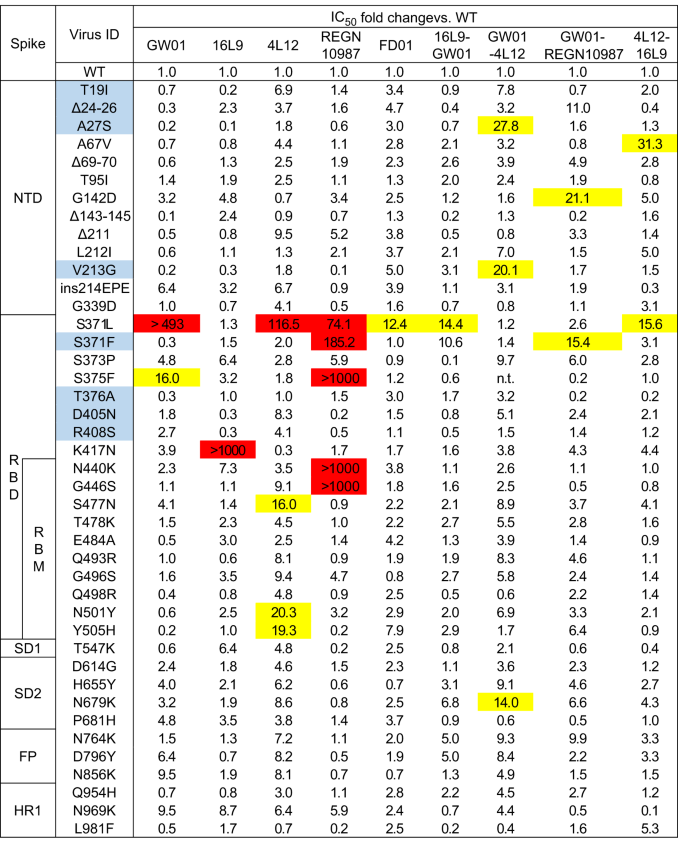 Table 1 Neutralization by GW01, 16L9, 4L12, REGN10987, and five bispecific antibodies against 42 variants containing single mutation present in the Omicron and BA.2.