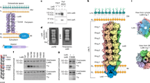 MlaD contains a periplasmic mammalian cell entry (MCE) domain and a single N-terminal transmembrane helix (TM) (Fig. 2c, left). On the periplasmic side, the MCE domain of MlaD is assembled as a homo-hexameric ring with the C-terminal α-helical bundle on top of the ring (Fig. 2c, middle). The six α-helices form a hollow hydrophobic channel, presumably to allow for phospholipid transfer17 (Fig. 2c, right). The linker between the periplasmic MCE domain and TM was not well resolved, likely due to its flexible conformation. A total of six MlaD TMs in the MlaFEDB complex are inserted into the membrane (Fig. 2c, middle). Three MlaD subunits incorporate with one MlaE (Fig. 2c, middle, d, right). Transmembrane helices D1 and D2 of MlaD form close hydrophobic contacts with the elbow Helix (EH) of MlaE, and D3 contacts the TM1 and TM3 of MlaE (Figs. 2d, right, 3e). Our structure demonstrates that Ile14 in the EH of MlaE contacts Ile8 in the D2 of MlaD (Fig. 3e). The I14N mutation of MlaE indeed rendered the bacteria sensitive to the treatment of SDS/EDTA (Supplementary information, Fig. S5), suggesting that the interaction between the TM of MlaD and the EH of MlaE is critical for the phospholipid transport function of MlaFEDB.
