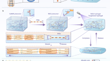 In semi-IPNs, specific polymer-based networks are crosslinked to other polymer chains, resulting in improved physicochemical properties, such as biocompatibility, mechanical strength and suitable rheological properties. For instance, Park et al. reported a semi-IPN structure containing cellulose nanofibers (CNFs) with a high aspect ratio of 240 and a polyacrylamide (PAM) mesh. Due to the strong interaction between the PAM network and rigid natural nanofibers, the compression strength of this semi-IPN system up to 3-fold higher than that of pure PAM143. Intriguingly, the PAM/BCNF composite hydrogels can be utilized for mechanical stress-responsive drug release and delivery. Similarly, this kind of hydrogel has shown great potential in the field of bone repair. For instance, Cui et al. designed semi-IPNs (OSA/Gel/CNF) through a facile one-step reaction of oxidized alginate (OSA), cellulose nanofibers, and gelatin (Gel), which mainly relied on the cooperative effects of hydrogen bonds and imine bonds32. As shown in detail in Fig. 5, during the synthesis of OSA/Gel/CNF from its three components, OSA acted as a natural reagent to link Gel via Schiff base reactions between amino and aldehyde groups, whereas CNFs formed hydrogen-bond interactions. The advantages of these semi-IPNs are as follows: (1) Compared to SA, OSA is more readily degraded in vivo and is more suitable for cell encapsulation. (2) The semi-IPNs exhibited both excellent mechanical properties and a high compressive modulus (>361.3 KPa). (3) As a result, the semi-IPNs showed good injectability and self-healing ability, both of which are promising for bone repair applications.