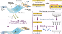 For example, Cao et al. developed stretchable electrodes with anti-friction properties by forming hydrogen bonds between hydrophilic PU and wet gold grains, achieving a robust interfacial binding strength of 1,243.4 N/m—significantly higher than polydimethylsiloxane (PDMS) or styrene-ethylene-butylene-styrene (SEBS) substrates (Fig. 3g)43. The Au/PU device demonstrated excellent electrical conductivity (<500 Ω/□) even after 1100 friction cycles at 130 kPa and maintained low electrical resistance (1.09 × 10⁻³ Ω·m) under 400% strain. This versatile electrode was successfully used as a bioelectrode and an anti-friction pressure sensor array.