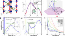 Results of the XMCD measurement at \(T=8\) K are shown in Fig. 3. Both Cr (Fig. 3a) and Mn (Fig. 3b) show a finite difference between x-ray absorption (XAS) curves measured at \(\pm 0.2\) T, which is well above the saturation field of Cr0.82Mn0.18Ge. The spectral line shape of Cr XAS and XMCD signals is similar to the one of the elemental Cr52 with the XMCD changing sign once from negative to positive at both \({L}_{3}\) (570–580 eV) and \({L}_{2}\) (580–590 eV) edges (Fig. 3a). In contrast, Mn spectra show multiplet features (Fig. 3b), indicating more localized orbitals, similar to the case of MnSi53 and Co8Zn8Mn454. Strikingly, the sign of the XMCD signal from Mn changes from positive at the main \({L}_{3}\) peak (635–640 eV) to negative at the \({L}_{2}\) edge, which demonstrates that the net magnetic moment of Mn is anti-aligned to the direction of the magnetic field, and also the magnetic moments of the Cr sub-lattice. The inversion behaviour between \({L}_{3}\) and \({L}_{2}\) edges is generic for XMCD spectra of \(3d\) transition metals and does not, by itself, indicate the presence of multiple magnetic environments or phase separation55. In our data, the opposite signs of the XMCD at the Cr and Mn edges—as opposed to the well-known sign reversal between the \({L}_{3}\) and \({L}_{2}\) edges of a single element—unambiguously indicate antiferromagnetic coupling between the fully field-polarized Cr and Mn sublattices, consistent with their ferrimagnetic ordering. Hence, Cr0.82Mn0.18Ge is, to our knowledge, the first example of a ferrimagnet among B20 materials. Notably, the antiferromagnetic interaction between Cr and Mn is hinted in the Cr1-xMnx Ge phase diagram reported by Sato et al. (see ref. 56), showing the spin-glass state for higher (\(x > 0.24\)) Mn concentrations.