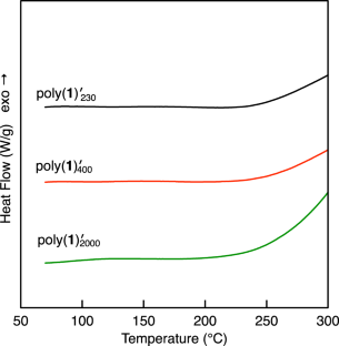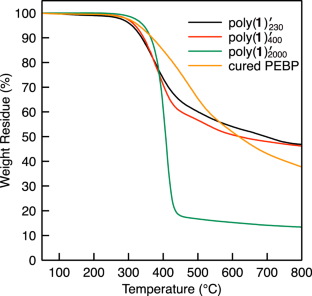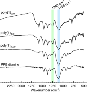Benzoxazine polymers containing phenyleneethynylene and polypropylene glycol (PPG) in the main chain, poly(1)230, poly(1)400 and poly(1)2000, were synthesized by a Mannich reaction of the corresponding ethynylenebisphenol, paraformaldehyde and PPG diamines with Mn = 230–2,000. The curing temperature of poly(1) decreased from 212 to 182 °C as the Mn of the PPG chain decreased from 2,000 to 230. Poly(1)230–2000 was heated at 200–250 °C to obtain the corresponding polymers, and poly(1)′230–2000 was cured by ring-opening polymerization of the benzoxazine moieties. The structures of the polymers were elucidated by 1H-NMR and IR spectroscopies before and after curing. Poly(1)′230–2000 became flexible upon increasing the Mn of the PPG chain. Poly(1)′230 showed Tg as high as 253 °C. Poly(1)′230–2000 was thermally stable at approximately 300 °C, presumably due to the existence of rigid phenyleneethynylene moieties.