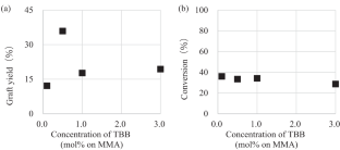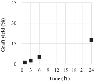 Tributylborane-initiated graft polymerization of methyl methacrylate on a poly(vinylidene fluoride) film was successfully achieved. The reaction was affected by the temperature and concentration of tributylborane, and a 41% graft yield was obtained under the optimized conditions. This value was higher than those obtained with other methods. This method facilitated modifications of only the surface of the poly(vinylidene fluoride) film, which was confirmed by IR spectroscopy and cross-section observations. New physical properties were added to the surface, such as hydrophilicity, which was confirmed by a decrease in the water contact angle from 82.5° to 68.6° after graft polymerization.