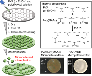 Water-insoluble micropatterned films were prepared from poly(vinyl alcohol) (PVA) (or ethylene-vinyl alcohol copolymer (EVOH)) and poly(methacrylic acid) (poly(MAAc)). The carboxy groups in poly(MAAc) underwent dehydration reactions with the hydroxy groups in the vinyl alcohol units during heating at 135 °C, which resulted in crosslinking with ester bonds and formation of a polymeric network in the micropatterned films. The surface structures of the micropatterned films and the shapes of the peeled microplastics in the supernatant were measured after decomposition in an oxidizing environment, after ultrasonic irradiation, and with both. The results revealed that the micropatterns could be peeled off from the films after they were subjected to appropriate decomposition conditions and maintained their patterned shapes.