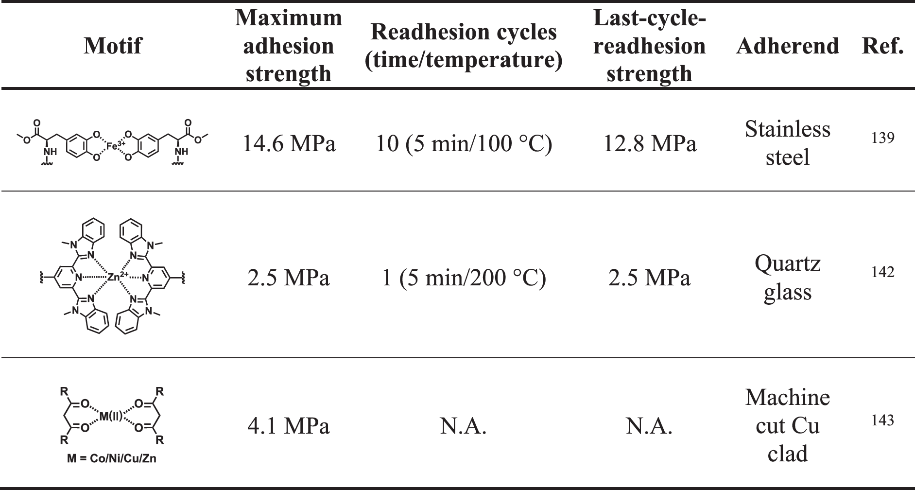 Table 8 Chemical structures, adhesion and readhesion properties, and adherends of the adhesion systems with metal-ligand complexes