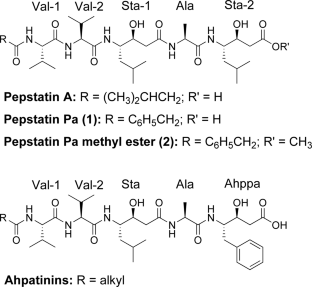 Miyano T, Tomiyasu M, Iizuka H, Tomisaka S, Takita T, Aoyagi T, Umezawa H. New pepstatins, pepstatins B and C, and pepstanone A, produced by streptomyces. J Antibiot. 1972;25:489–91.