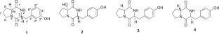 Two new diketopiperazines, namely samsoniellain A (1) and samsoniellain B (2), together with two known compounds (3, 4) were isolated from Cordyceps fungus Samsoniella sp. XY4. The planar structures of 1 and 2 were determined by HRESIMS, 1D and 2D NMR spectroscopy. The absolute configurations of 1 and 2 were determined by comparison of quantum chemical TDDFT calculated and experimental ECD spectra. Results of antimicrobial activity indicated that compound 2 showed weak bacteriostatic activities against S. typhimurium χ 8956, H. influenza ATCC 10211, MRSA 2024 with the MIC values of 128, 256, and 256 μg ml−1, respectively. This is the first report about secondary metabolites of Samsoniella sp.