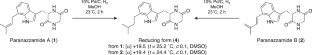 Two new cyclic dipeptides, paranazzamides A (1) and B (2) containing a C7-prenylated tryptophan, were isolated from a culture broth of snake fungal disease-isolate Paranannizziopsis sp. UH-21. This is the first report on the new secondary metabolites from Paranannizziopsis sp. The planar structures of 1 and 2 were elucidated using various spectroscopic techniques including MS and 1D/2D NMR. The absolute configuration of 1 was assigned by comparison with the synthesized compound. Compounds 1 and 2 exhibited no antifungal activity, no antibacterial activity, and no cytotoxic activity even at a concentration of 128 µg ml−1, whereas 1 and 2 exhibited amphotericin B potentiating activity against Candida auris in combination treatment.